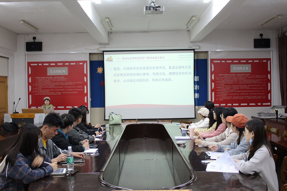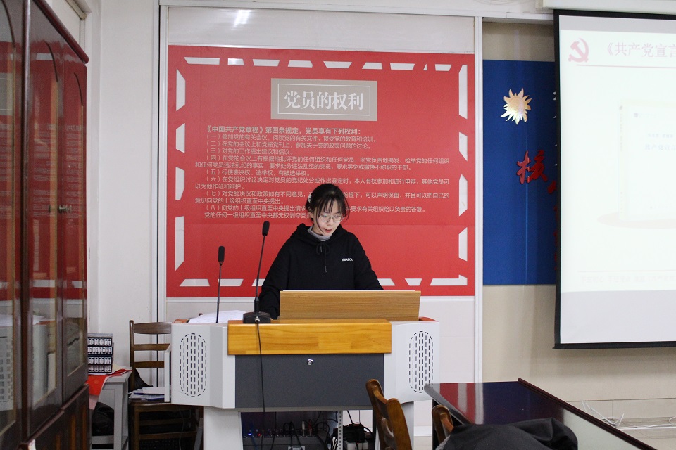 会上,吕玥首先从中国共产党发展史中得到的启示展开,并讲述了中国道路的独到之处。她表示作为党员应充分认识开展党史学习教育的重要意义,要始终牢记自己身为党员的使命,学习马克思主义,用党的创新理论武装头脑,坚持以人民为中心的发展思想,全心全意为人民服务。她强调,祖国一天比一天强大,一天比一天繁荣,这离不开中国共产党的领导,作为党员更要起到模范先锋作用。会上,吕玥提出了作为党员需要“慎独、坚定理想信念、守住底线、提高境界、勇于担当”,还建议同学们多关注国家大事。宣讲中,各位员工党员认真做好记录。随后,员工党支部三名代表同学结合今日的党史学习发表了自己对党的一些看法以及自己将如何践行党员的责任与义务。