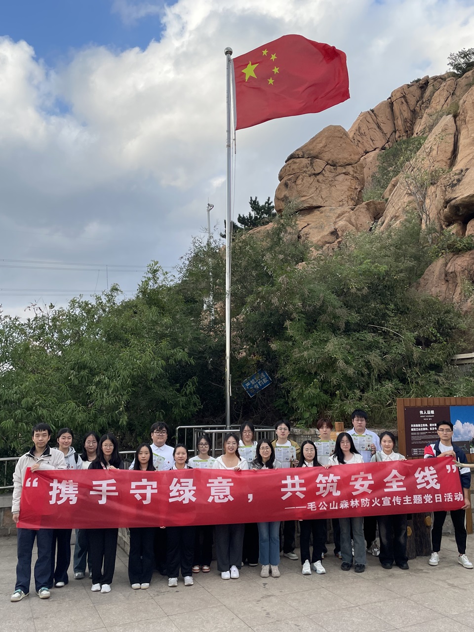 为切实增强广大群众的森林防火意识,提高公众的森林防火意识,10月7日,公司开展“携手守绿意,共筑安全线”毛公山森林防火宣传主题党日活动,为居民游客科普森林防火安全知识。党日活动由公司第四党支部书记许菲菲带领,全体本科生党员参加。