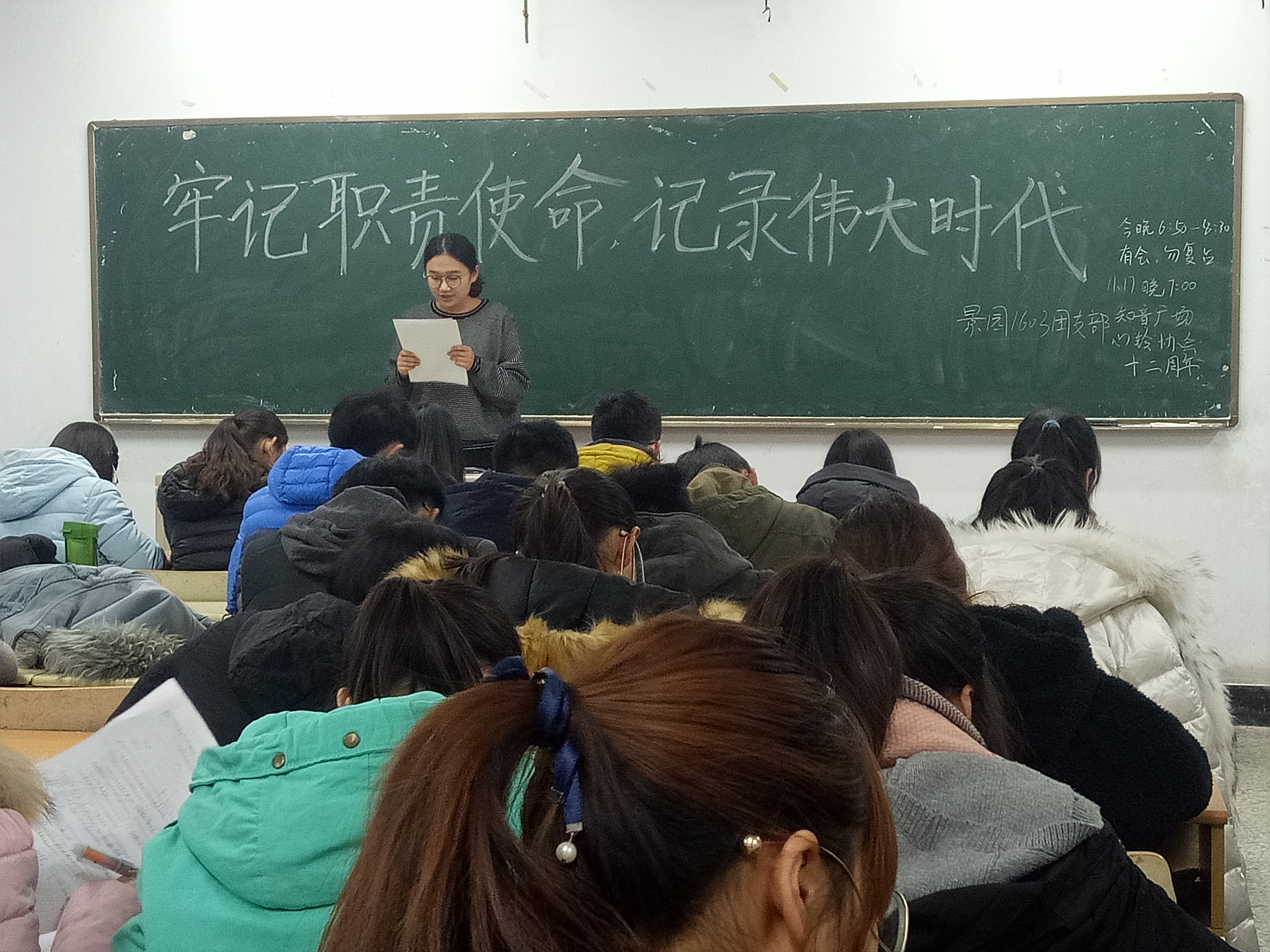 11月19日,太阳集团tcy8722于教学区开展了“牢记职责使命,记录伟大时代”主题团课。旨在帮助同学们深入了解十九大精神内涵,学习十九大精神,做合格老员工。16、17级全体团员参加此次教育活动。