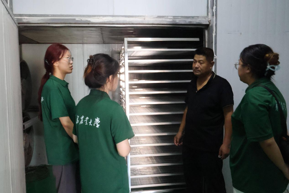 前屯村传峰合作社,是由几家农户组成的自家经营的合作社,规模不大,连片的桑树林间虽有简单的种植区域,但并无专门的生态大棚。负责人刘传峰介绍,合作社以生产桑叶茶,桑葚干为核心,年产出桑葚干、桑叶茶等产品近20吨。由于是农户自营,场地有限,没有充足的空间设置专门的农事体验区,现有的一些简单互动项目也只能小规模开展,这让团队原本考虑借鉴的实践环节参考受到了一定限制。队员们还是仔细记录下了现有项目的情况,思考如何在有限条件下设计合适的研学内容。