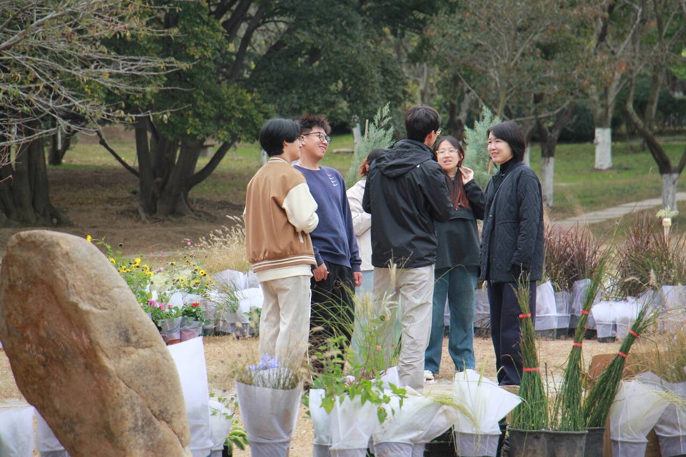 劳动过程中,同学们根据尊重、顺应、保护自然的生态理念,秉持提升园林素养的初衷,充分发挥创新思维与动手能力,为城市绿色建设添砖加瓦。实践队伍首先完成清理场地等前期准备工作,为实践方案落地做好准备,随后因地制宜完成种植定位,明确各种植物种植区域,根据要求选择适宜花卉种植,并完成植物支撑与固定,实现团队设计方案的花镜造景。