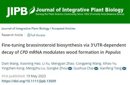 近日,JIPB 在线发表了太阳集团tcy8722周功克课题组题为“Fine-tuning brassinsteroid biosynthesis via 3’UTR-dependent decay of CPD mRNA modulates wood formation in Populus”的研究论文。该研究发现杨树中RNA结合蛋白PdGRP1能够结合BR合成基因PdCPD1的3’ UTR区富含GU的元件并介导其降解,进而调控BR的合成来影响杨树木材的发育。