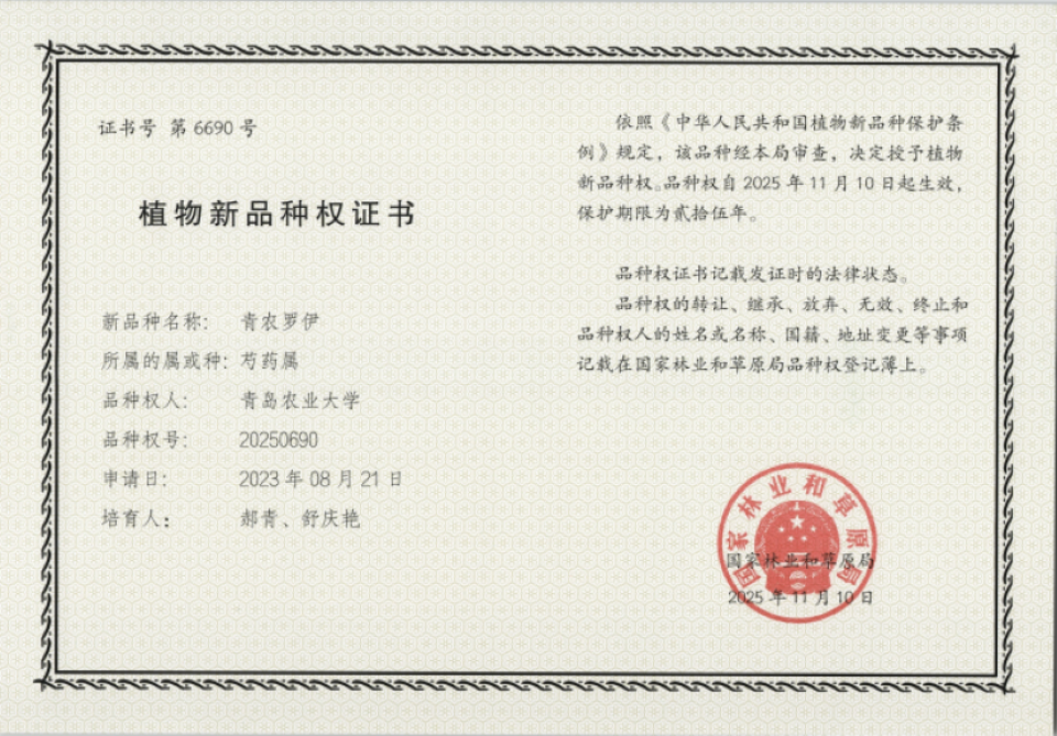 近日,太阳集团tcy8722牡丹种质创新与利用团队再添新成果,自主培育的牡丹新品种‘青农罗伊’获批国家林业和草原局颁发的植物新品种权。此前,团队于2024年底已有‘紫梦秋华’、‘蓝粉佳丽’和‘一线牵’三个新品种成功获批。此外,团队还积极参与合作育种,与中国科公司植物研究所联合申报的‘丝路花羽’、‘赤诚之心’、‘紫色魅力’、‘国植红曼’和‘国植玉兔’等5个新品种也已于近日同时成功获批,其中团队成员担任第二培育人。
