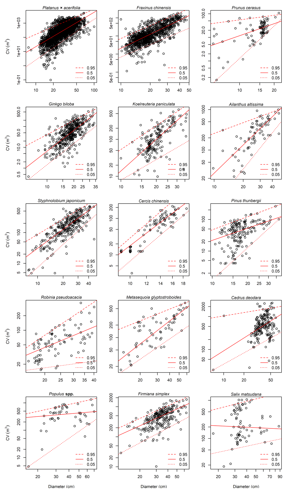 异速生长表示相对生长不成比例的生长关系,最先由赫克斯利 (I.S.Huxley)等人提出用于研究招潮蟹 (fiddler crab)的钳子大小随螃蟹身体的变化。随着国内外对异速生长的研究,其已经广泛运用于各个领域。城市林业中树木异速生长常用于制定常见绿化树木间距指南,预测树木生长,预估树木社会、经济、生态效益等,对城市森林发展具有重要指导意义。研究针对青岛市7个区街道常见绿化树种,使用分位数回归(95%、50%、5%)建立了15种树种关于胸径与树高、冠幅、树冠投影面积、树冠体积的异速生长方程。