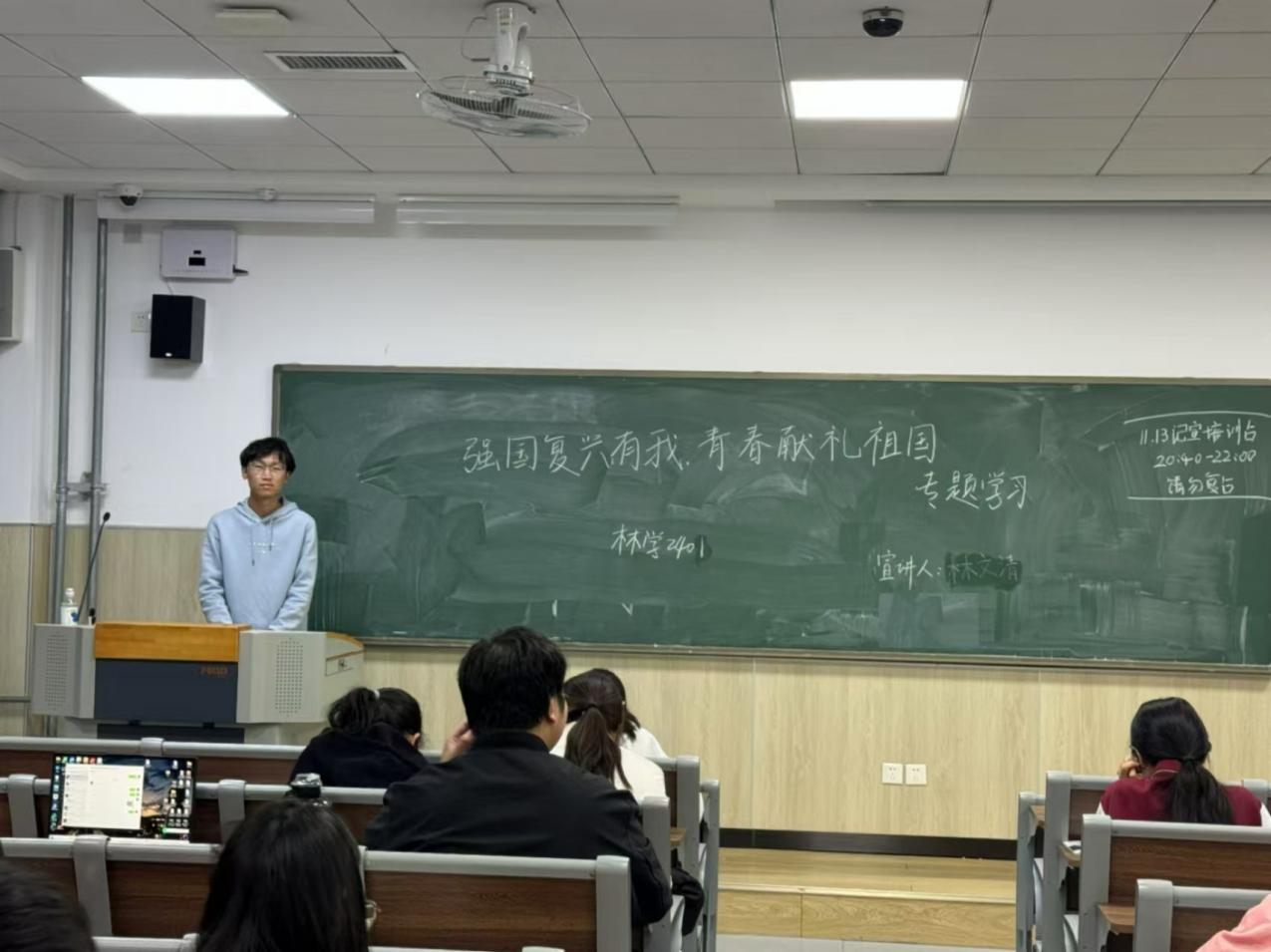 11月2日,太阳集团tcy8722于博学楼C区开展“强国复兴有我,青春献礼祖国”政治理论学习。各班团支部书记主持,全体员工参与。