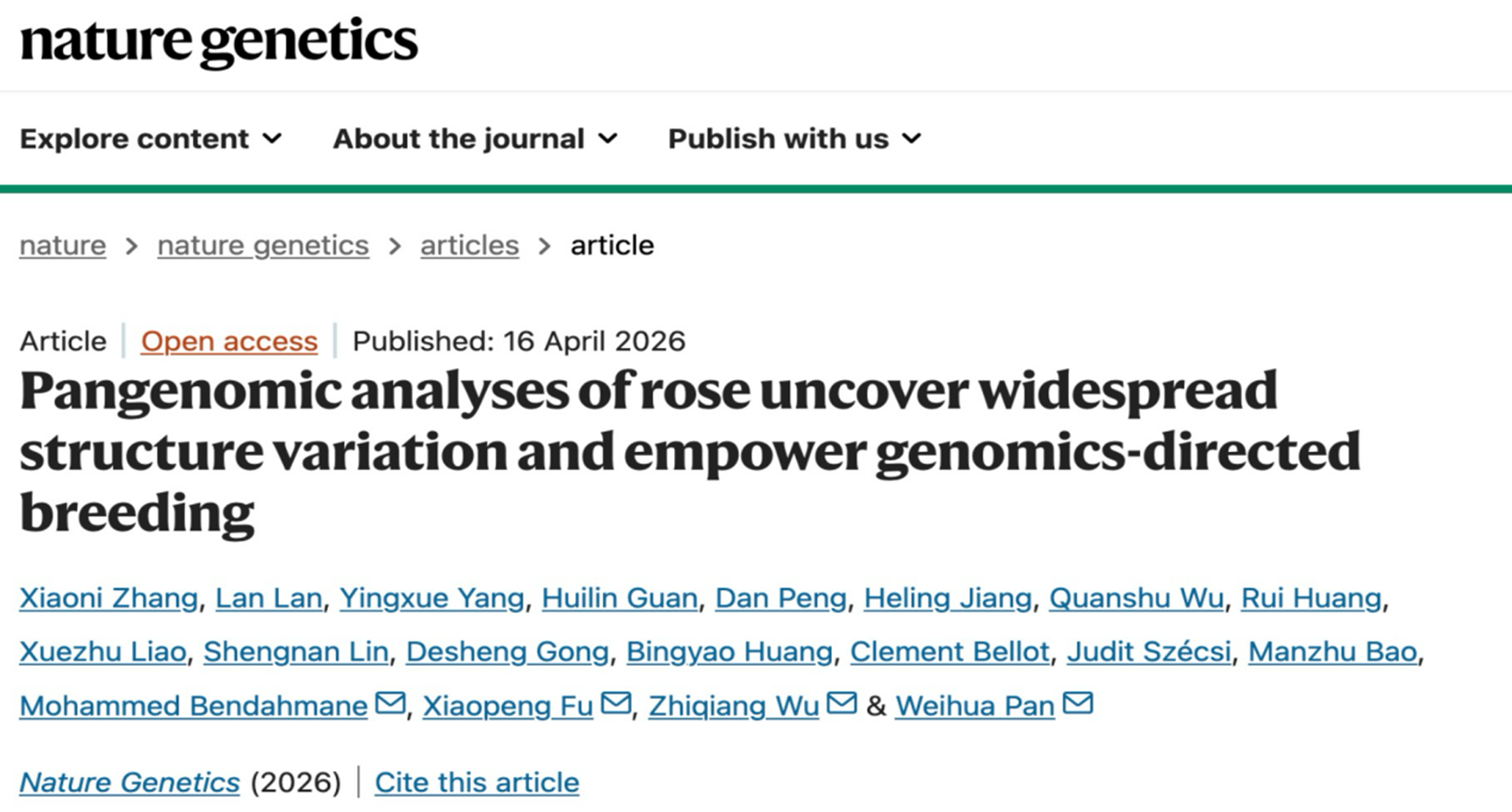 2026年4月16日,太阳集团tcy8722青年教师张晓妮以第一作者身份在国际顶尖期刊《Nature Genetics》上在线发表了题为“Pangenomic analyses of rose uncover widespread structure variation and empower genomics-directed breeding”的研究论文。该研究成功构建了全球首个单倍型解析的月季泛基因组图谱,系统解析了蔷薇亚属的遗传多样性。这一成果有望推动月季育种从传统经验模式向精准设计跨越,助力开启月季“第二次育种革命”。