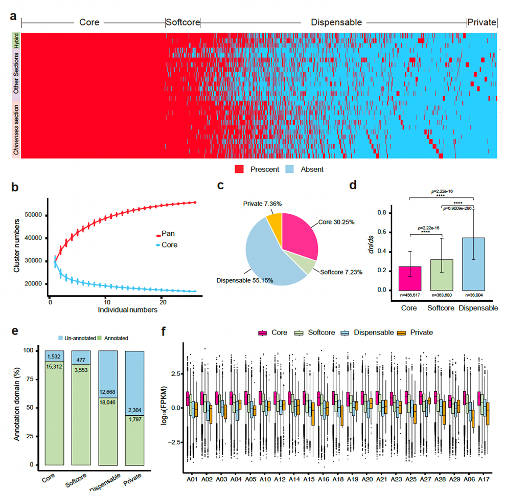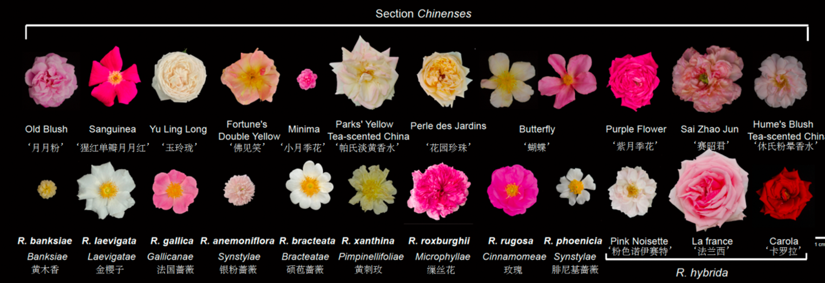 研究团队选取了26份月季代表性种质,涵盖蔷薇亚属9个分组,包括中国古老月季,欧洲古老月季,早期育种材料和现代月季等种质。利用HiFi和HiC等测序技术,通过从头组装,成功获得23个高质量单倍型基因组。结合3个已发表基因组,最终构建了包含55个高质量单倍型的蔷月季泛基因组图谱,是目前最为完整和系统的月季基因组资源,为系统解析月季观赏性状的遗传基础、挖掘优异变异,推动分子设计育种奠定了重要基础。