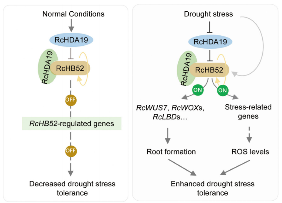该研究发现,干旱处理显著影响月季整体组蛋白乙酰化水平,多个组蛋白去乙酰化酶基因在胁迫不同时期表达变化显著。通过筛选鉴定到一个关键基因RcHDA19,其参与调控干旱胁迫响应。比较转录组分析显示,RcHDA19能够影响多个转录因子家族成员的表达。进一步实验证明RcHDA19能够与转录因子RcHB52相互作用,形成蛋白复合体。RcHB52过表达可显著增强月季的干旱适应性,而沉默RcHB52则降低其耐受性。此外,RcHB52能够直接结合下游靶基因RcWUS7和RcWOX14的启动子区域,通过影响核小体组蛋白乙酰化水平调控其表达,进而改变根系发育与构型,最终影响植株对干旱的适应能力。该研究系统揭示了RcHDA19–RcHB52分子模块在表观修饰层面调控根系构型,进而参与月季干旱响应的分子机制。
