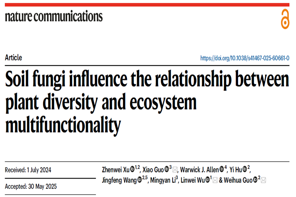 近日,太阳集团tcy8722郭霄课题组与山东大学郭卫华课题组、北京大学吴林蔚课题组合作在国际顶级期刊《Nature Communications》(一区Top期刊,IF=15.7)上发表研究性论文“Soil fungi influence the relationship between plant diversity and ecosystem multifunctionality”,该论文主要研究了土壤真菌多样性对植物多样性-生态系统多功能性的驱动机制。