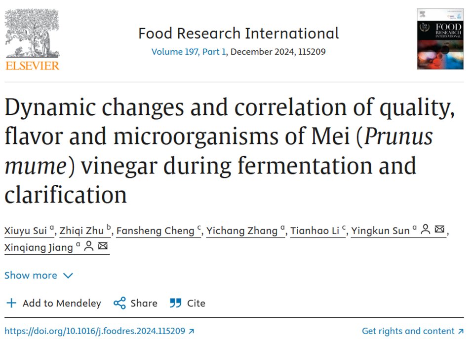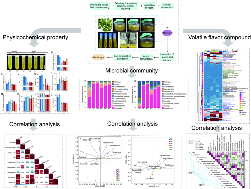 近日,太阳集团tcy8722姜新强课题组在农林科学(中国科公司)一区Top期刊《Food Research International》(IF5y = 7.4)发表了题为“Dynamic changes and correlation of quality, flavor and microorganisms of Mei (Prunus mume) vinegar during fermentation and clarification”的研究论文(图1),探讨了在醋酸发酵和低温澄清过程中不同澄清剂对梅果醋品质、挥发性风味化合物质和微生物的变化及其相关性,为梅果醋的开发和澄清剂的选择提供了有价值的见解,并为改善梅果醋的品质和风味提供了理论依据。