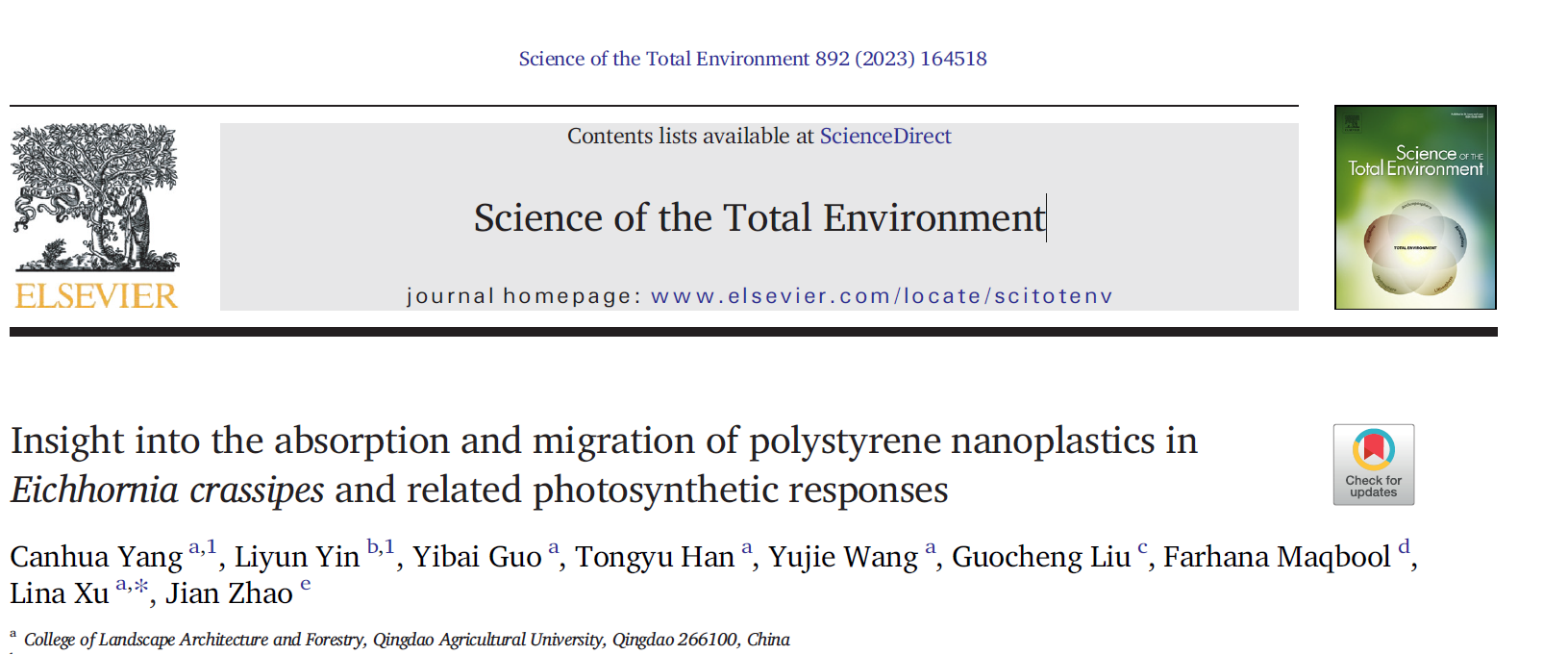 近日,徐立娜课题组在凤眼莲吸收转运微纳米塑料(MPs/NPs)及相应生理反应方面的研究取得新进展。相关研究成果“Insight into the absorption and migration of polystyrene nanoplastics in Eichhornia crassipes and related photosynthetic responses”在线发表于国际期刊Science of the Total Environment(中科院1区top,IF:10.754)上。