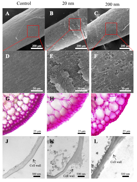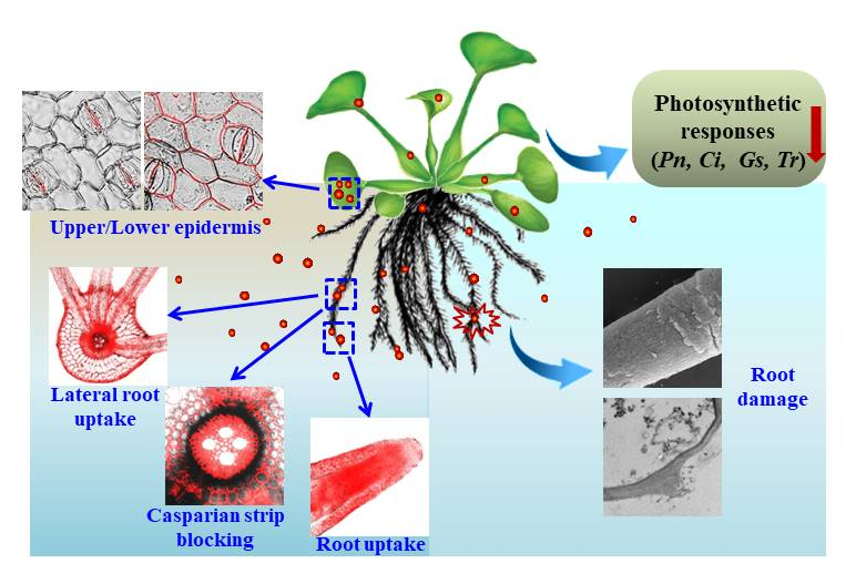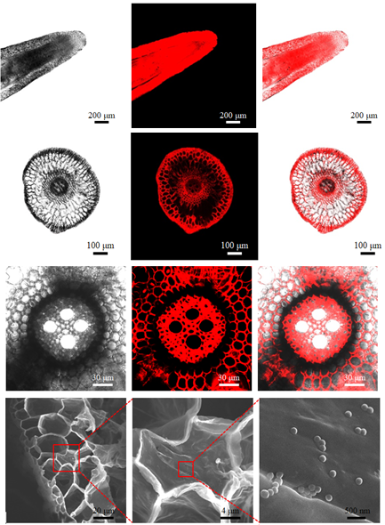 课题组通过暴露实验发现MPs/NPs能够破坏凤眼莲根系表皮结构,导致果胶质的减少和细胞壁结构的损伤。其中,塑料颗粒越小,造成的损伤越严重。 不同粒径的塑料颗粒可以通过凤眼莲根系和触水叶片进入植物体,其中根系是MPs/NPs进入凤眼莲体内的主要途径。MPs/NPs可以通过细胞壁孔、破坏细胞壁结构、叶片气孔以及侧根间隙进入凤眼莲体内。进入植物体后,MPs/NPs主要存在于细胞壁、细胞间隙和维管柱中,并通过质外体途径和共质体途径在凤眼莲体内运输。然而,根系成熟区凯氏带阻止了MPs/NPs从表皮向维管束的横向运输。