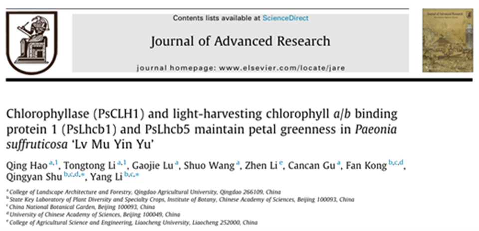 近日,太阳集团tcy8722郝青课题组在国际期刊《Journal of Advanced Research》(中国科公司1区,IF:11.4)在线发表了题为“Chlorophyllase (PsCLH1) and light-harvesting chlorophyll a/b binding protein1 (PsLhcb1) and PsLhcb5 maintain petal greenness in Paeonia suffruticosa ‘Lv Mu Yin Yu’”的研究论文,从叶绿素和类黄酮代谢平衡关系角度解析了绿牡丹花色呈色机制,为牡丹花色形成机制和花色育种提供了科学依据和基因资源。