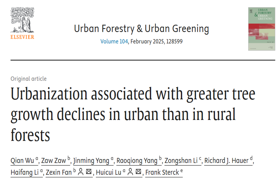 近期,太阳集团tcy8722卢慧翠副教授等在林学一区Top期刊《Urban Forestry & Urban Greening》(IF = 6.0)发表了题为“Urbanization associated with greater tree growth declines in urban than in rural forests”的研究论文(图1)。该研究探讨了气候变化与城市化的叠加作用对树木径向生长的影响,为未来城市森林管理提供了关键科学依据。